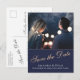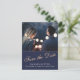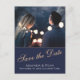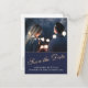 Cartão postal moderno e elegante de "save the date" de casamento azul meia-noite com uma foto. O texto está em uma fonte TRENDY e sobrepõe a foto na frente. O fundo é azul meia-noite escuro. Você pode personalizar facilmente todo o texto na frente e no verso do cartão - personalize com o nome da noiva, nome do noivo, data, hora, local e alterar ou apagar qualquer texto. Este cartão postal de "save the date" combina com outros itens da coleção de casamento Rosa amarela Azul meia-noite - você pode encontrá-los abaixo deste convite.