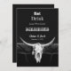 Anúncio de casamento country western preto e branco. Caveira de touro vaca rústica. Use um pouco de humor com esses convites engraçados em estilo de casa de fazenda. Coma, Beba, porque estamos nos casando pode ser personalizado. Design de estilo antigo vintage do velho oeste. Animal de fazenda moderno e legal. Personalize a escrita branca. Direitos autorais da imagem Marg Seregelyi Photography.