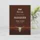 Anúncio de casamento country western cowboy comer beber casado diversão madeira marrom. Crânio de touro rústico. Use um pouco de humor com esses convites engraçados e fofos em estilo de casa de fazenda. Coma, Beba, porque estamos nos casando pode ser personalizado. Estilo de design trendy, velho oeste selvagem vintage antigo. Animal de fazenda legal. Personalize a escrita e a tipografia. Direitos autorais da imagem Marg Seregelyi Photography.