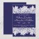 Anúncio de casamento azul branco elegante. Seus detalhes são acentuados por bordas superior e inferior desenhadas com Dianthus, Lírio do Vale, folhagens e Joias Senhoras. Os cartões são revertidos para um azul real profundo.