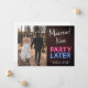 Um elopeio moderno ou um anúncio de casamento menor para informar a família e os amigos que circunstâncias imprevistas mudaram seus planos de casamento, exigindo que você fuja ou reduza o número de convidados no seu casamento, mas que você vai receber uma festa de celebração no futuro. A frente apresenta sua foto de um lado e "Casado Agora" em uma escrita branca e "Partido Mais Tarde" em tipografia vermelha e azul com um efeito luminoso luminoso luminoso luminoso luminoso contra um fundo de tijolos. Ao contrário, você pode personalizar sua mensagem em mais detalhes e seus nomes em um script semelhante a assinatura.