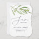 Um ramo de oliveira ousado acompanha os detalhes do seu casamento pessoal neste design de cartão de anúncio atemporal. As folhas em aquarela em tons verdes suaves são perfeitamente equilibradas no fundo branco, dando um visual sofisticado. A adição de uma cor ousada no verso aumenta a sensação de elegância e qualidade. Parte de uma coleção de casamento na moda.