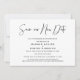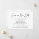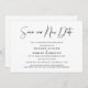 Mínimo e simples adiamento de casamento moderno, anúncio preto e branco. "Salvar nossa Nova Data" está escrito em um roteiro de na moda e você pode personalizar facilmente com os detalhes do adiamento do casamento.