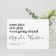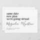 Deixe seus amigos e familiares saberem sobre os novos planos menores para o seu casamento com este moderno anúncio de casamento virtual. Certifique-se de personalizar a mensagem para incluir o endereço do site do seu casamento. Ou para que eles saibam como podem assistir ao seu casamento virtualmente.