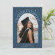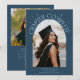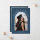 Modern and whimsical graduation announcement photo card featuring an arched frame photo on the front and 1 on the back. The text says "Chapter Complete" with hand drawn stars. Add the graduate's name, information, and message to personalize this card. Navy blue background.