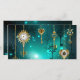 Chaves Douradas e antigas com engrenagens e marcadores penduram em correntes douradas sobre fundo verde luminoso.