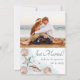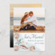 Elegante, chá escuro e cobre, cor d'água, sol de verão e solha-do-mar pintada à mão. A design apresenta conchas marinhas, estrelas-do-mar, um cavalo-marinho e recifes de corais em elogios a tons de verde profundo e coral com uma abertura de verde-menta para um efeito de água. Os pormenores em caracteres verdes e escuros modernos são enquadrados pela fronteira náutica da garland de coral, conchas e estrelas-do-mar.