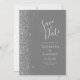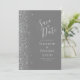 A borda esquerda deste elegante casamento moderno salve o cartão de data apresenta uma borda cintilante. O texto personalizável combina a escrita manual de cinzas prateadas, fontes copperplate e itálico em um fundo de cinza. O verso apresenta uma cinza e uma design prateada correspondentes.
