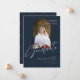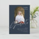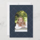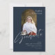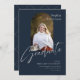 Este anúncio de graduação em forma plano de 5" x 7" apresenta uma fotografia em forma de arco na frente, sobre um fundo azul de marinho, com a inscrição de cinzas luminosas. A parte de trás tem uma foto em forma de arco com design de linha de diamante fino em cinza de luz sobre um fundo azul marinho. Os marcadores incluem, nome do formando, nome da universidade ou universidade, o grau, a área de foco do grau e uma linha adicional para informações adicionais, como honras especiais.