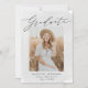 Anúncio elegante de quatro fotos com "Formando" exibido em um roteiro preto de caligrafia moderna com fundo de lavagem a cores da cinza de luz. Personalize a frente do anúncio de graduação da cinza adicionando sua foto favorita e o nome do formando, a escola e o ano de graduação. O cartão de lançamento de graduação é revertido para exibir 3 fotos adicionais com espaço para texto personalizado, como planos futuros do formando, realizações, detalhes da festa de formatura, etc. O design é perfeito para segundos graus e formandos universitários.