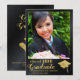 Crie um anúncio exclusivo de graduação personalizada em preto e ouro com sua foto de formando para a classe de 2025. Esta design é decorada com um boné formando e ilustrações de diploma em cores amarelas ouros. O modelo facilita a personalização do anúncio de formando com nome, ano, nome escolar, foto e outro texto.