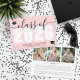 Um anúncio clássico, porém moderno, de graduação horizontal. A frente apresenta uma "Classe de 2025" sobredimensionada em negrito e branco, com o ano em branco nítido sobre um fundo rosa-claro. Os sotaques de guião preto elegantes e dois ícones de boné de formatura preto acrescentam um toque comemorativo, com espaço abaixo para o nome do formando e a escola. As cores podem ser personalizadas para corresponder às cores da escola para uma aparência personalizada. O verso apresenta uma colagem de fotos com três pontos de imagem e espaço abaixo para uma mensagem sincera dos pais, destacando realizações e expressando orgulho. Totalmente personalizável, este design é perfeito para celebrar este marco importante.