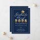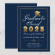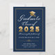 Anuncie sua graduação em estilo com este elegante cartão de anúncio personalizado apresentando um design de tipografia com as palavras "Classe de Formando de 20XX" acentuadas por um boné de formando dourado falso sobre um fundo azul marinho com texto personalizado em branco. Desenhada por Susan Coffey.