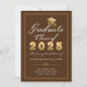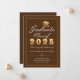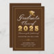 Anuncie seu segundo grau ou formandos em estilo com este elegante cartão de anúncio personalizado com as palavras Classe de Formando de 20XX em tipografia de script branco e dourado brilhante com seu nome, escola e data para personalizar acentuado por um falso boné de ouro em um fundo marrom. Desenhada por Susan Coffey.