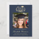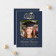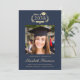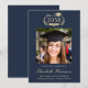 Celebrate your graduate's remarkable academic achievement with this elegant college graduation announcement, designed with a timeless crest motif and classic script and typography. Featuring their class year framed by laurel branches and mortarboard and diploma icons, this design delivers a traditional collegiate look with enduring appeal. The centered photo layout highlights the grad’s portrait, while the text below showcases their name, university, and degree. The rich dark navy blue background paired with light gold lettering creates a sophisticated contrast that feels both formal and celebratory. Fully customizable, this graduation announcement can be adapted for high school graduates as well.