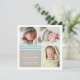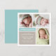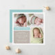 Compartilhe suas notícias felizes com este cartão de anúncio de nascimento moderno em aquamarina e taupe. Uma faixa "Apresentamos" em azul-teal ancoram o layout quadrado limpo, com tipografia de nome em script e serifa e espaço para três das suas fotos favoritas do recém-nascido. Tons aquamarina, taupe quente e branco com parte de trás aquamarina sólida. Funciona lindamente para um menino ou menina. Todo o texto é totalmente personalizável.