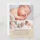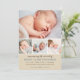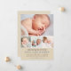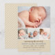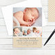 Cartão de anúncio de nascimento fotográfico doce e elegante que mostra quatro fotos do seu bebê com um cabeçalho de caligrafia "Anunciando a Chegada De", estatísticas de nascimento e um acento de coração. Um fundo bege neutro combina com caligrafia azul-ardósia e texto cinza-marrom quente para um visual rústico e terroso. Uma mensagem da família "Recebido com Amor" adiciona um toque pessoal. O verso apresenta um padrão de listras diagonais bege e branco coordenado. Todas as cores e textos são totalmente personalizáveis.