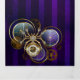 Aranha-do-galo feita de ouro e aço com relógios antigos decorados com engrenagens de ouro sobre fundo roxo, listrado, texturizado com lentes e engrenagens de latão. Estilo Steampunk.