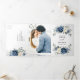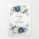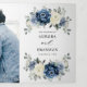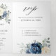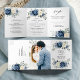 Convite Tri-Fold de casamento floral azul poeirento com buquê elegante de azul marinho, azul real, branco, dourado, champanhe marfim, rosa cor de blush, botões de flor de ranúnculo e folhas de eucalipto verde-sage e buquê de aquarela elegante. Por favor, entre em contato comigo para qualquer ajuda na personalização ou se você precisar de qualquer outro produto com este design.
