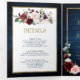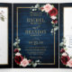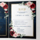 Convite de casamento floral geométrico burgundy azul-marinho escuro com um buquê elegante de azul-marinho, azul-real, branco, rosa suave, burgundy, rosa marsala e folhas de eucalipto verde-sage e uma moldura geométrica neutra com brilho dourado elegante. Por favor, entre em contato comigo para qualquer ajuda na personalização ou se você precisar de qualquer outro produto com este design.