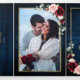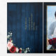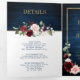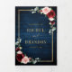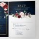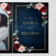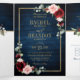 Convite de casamento floral geométrico burgundy azul-marinho escuro com buquê elegante de azul-marinho, azul-real, branco, rosa-choque, burgundy, rosa marsala e folhas de eucalipto verde-sage e moldura geométrica neutra com brilho dourado elegante. Por favor, entre em contato comigo para qualquer ajuda na personalização ou se você precisar de qualquer outro produto com este design.