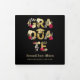This graduation invitation with photos and flowers stands out for its matte black background that highlights the main word with a gold glitter texture effect. The design combines script typography with botanical illustrations in tones of vibrant hot pink, gold, cream, and gray, achieving a sophisticated and modern aesthetic. This tri-fold graduation card with cap organizes four spaces for personal photographs, allowing the floral elements to provide an organic contrast on the dark canvas without using real embossing, maintaining a flawless chromatic harmony in every panel.