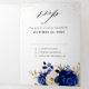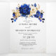 Convite de casamento com tema azul real dourado elegante com buquê de rosas nas cores azul real, azul marinho, dourado e amarelo e folhas de eucalipto. Por favor, entre em contato para ajuda na personalização ou se precisar de outro produto com este design.
