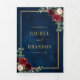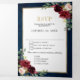 Convite de casamento floral geométrico azul marinho e burgundy com um buquê elegante de azul naval, azul real, branco, rosa, burgundy, rosa marsala e folhas de eucalipto verde-sage e uma moldura geométrica neutra com brilho dourado elegante. Por favor, entre em contato comigo para qualquer ajuda na personalização ou se você precisar de qualquer outro produto com este design.