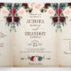 Modelo de cartão de convite triplo para casamento em tons de burgundy vermelho, rosa e azul marinho com aquarela, com folhagem botânica verde e folhas de eucalipto em fundo de madeira, estilo rústico e sofisticado. Este lindo design, fácil de personalizar, combina facilmente com as cores, estilos e tema do seu casamento e é uma escolha perfeita para casamentos de outono, verão ou inverno. Você pode encontrar mais designs correspondentes na minha loja ou entrar em contato comigo se precisar de ajuda na personalização do design.