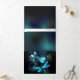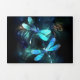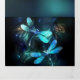 Duas libélulas transparentes, luminosas, turquesas, desenhadas artisticamente sobre fundo noturno, com algas e vagalumes luminescentes do lago. Dragonfly brilhante.
