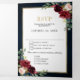 Convite para casamento geométrico com burlões azuis marinhos escuros, com buquê elegante de azul marinho, azul real, branco, branco, borrifado, rosa de marsala e folhas verdes de eucalipto sábio e elegante quadro neutro geométrico de brilho dourado. Entre em contato comigo para obter ajuda sobre a personalização ou se você precisar de outro produto com este design.