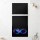 Símbolo luminoso, roxo e infinito com beija-flor azul voadora, luminosa, em fundo preto. Neon.