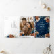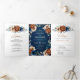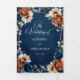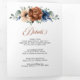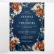 Elegante convite de casamento com tema floral terroso laranja, azul marinho, apresentando um buquê elegante de rosas e peônias azul marinho, terracota e folhas de eucalipto verde. Entre em contato para ajuda na personalização ou se precisar de outro produto com este design.