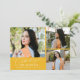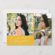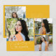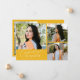 Cartão de foto de anúncio de formatura moderno e caprichoso com 3 fotos na frente e 1 no verso. O texto diz "comemorando a formatura" em fonte manuscrita. Adicione o nome do formando, informações e mensagem para personalizar este cartão. Amarelo.