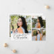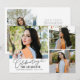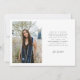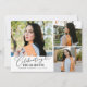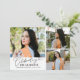 Cartão de foto de anúncio de graduação moderno e caprichoso com 3 fotos na frente e 1 no verso. O texto diz "comemorando o graduado" em fonte de caligrafia. Adicione o nome do graduado, informações e mensagem para personalizar este cartão. Branco.