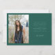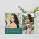 Cartão de foto de anúncio de graduação moderno e caprichoso com 3 fotos na frente e 1 no verso. O texto diz "comemorando o graduado" em fonte de caligrafia. Adicione o nome do graduado, informações e mensagem para personalizar este cartão. Verde.