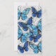 Composição vertical de borboletas de morfo realistas, azuis e brancas sobre fundo texturizado de cinzas. Borboleta azul Morpho.