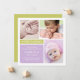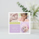 Apresente a sua menina com este cartão de anúncio de nascimento quadrado moderno em bloco de cores. Uma faixa "Apresentando" em verde chartreuse adiciona um toque fresco de cor acima de um bloco de texto lavanda com o nome do bebê em letra cursiva, detalhes do nascimento e uma mensagem dos orgulhosos pais. Três espaços para fotos mostram o seu recém-nascido em um layout de colagem quadrada. O verso apresenta um acento verde coordenado. Todo o texto, cores e fotos são totalmente personalizáveis.