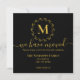 Este cartão de anúncio de mudança é sofisticado e elegante. Apresenta um fundo preto com um monograma de coroa botânica dourada e tipografia dourada.
