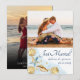 Romântica coleção de casamento em aquarela azul empoeirado e dourado de verão, sol e mar. O design apresenta conchas, estrelas-do-mar e recife de coral em tons complementares de azul, dourado e branco com um toque de azul para um efeito aquático. Os seus detalhes em letras modernas em azul naval são emoldurados pela guirlanda de aquarela náutica de coral elegante, conchas e estrelas-do-mar.