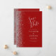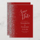 A borda esquerda deste elegante casamento moderno salve o cartão de data apresenta uma borda cintilante. O texto personalizável combina a escrita manual de cinzas prateadas, fontes copperplate e itálico em um fundo vermelho crítico. O verso apresenta um design vermelho e prateado correspondentes.