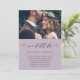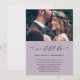 Anúncio simples de mudança de data. Este anúncio simples é uma maneira elegante de informar aos convidados que a data do casamento foi remarcada devido a circunstâncias imprevistas, e inclui a nova data do casamento. Este anúncio moderno apresenta uma adorável caligrafia preta "ainda nos casamos" em um fundo roxo defumado com a foto do casal, e um tom suave de roxo na parte de trás do cartão.