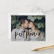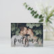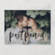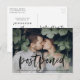 Precisa alterar a data do seu casamento? Nossos elegantes cartões-postais de adiamento de casamento são perfeitos para notificar os convidados da sua nova data de casamento. O cartão-postal de alteração de data apresenta "adiado" em uma sobreposição de letra brush manuscrita preta com a sua foto de noivado horizontal. Personalize o cartão-postal adicionando seus nomes, endereço de retorno, detalhes do casamento, site do casamento, etc.