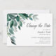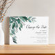 O anúncio de adiamento de casamento botânico apresenta folhas verdes de eucalipto exuberantes ilustradas em aquarela. Personalize com seus detalhes de casamento alinhados à direita em uma mistura de blocos tradicionais e tipos modernos de caligrafia. Cartões invertidos a verde florestal sólido.