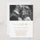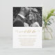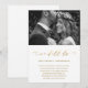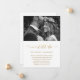 Elegante anúncio de mudança de data de adiamento de casamento. Este simples anúncio é uma maneira sofisticada de informar aos convidados que a data do seu casamento foi remarcada devido a circunstâncias imprevistas, e inclui a nova data do casamento. Este anúncio moderno apresenta uma bela caligrafia "ainda nos casamos" em falso ouro sobre um fundo branco com a foto do casal.