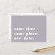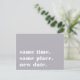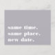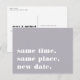 Precisa adiar ou remarcar o seu casamento? Informe os convidados com esses cartões-postais modernos e alegres em cinza chic com letras brancas nítidas. O design simples e tipográfico apresenta "mesmo horário, mesmo local, nova data" na frente, com a nova data do casamento e detalhes no verso.