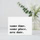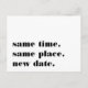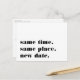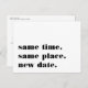 Precisa adiar ou remarcar o seu casamento? Deixe os convidados saberem com esses cartões-postais modernos e alegres em branco com letras pretas ricas. O design engraçado e inteligente baseado em tipografia apresenta "mesmo horário, mesmo local, nova data" na frente, com a nova data do casamento e detalhes no verso.
