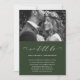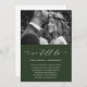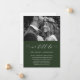 Elegante anúncio de adiamento de casamento com mudança de data em verde floresta e branco. Este anúncio simples é uma maneira sofisticada de informar aos convidados que a data do seu casamento foi remarcada devido a circunstâncias imprevistas, e inclui a nova data do casamento. Este anúncio moderno apresenta uma bela caligrafia branca "nós ainda nos casamos" em um fundo verde escuro com a foto do casal, e um verso branco do cartão.