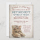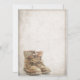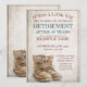 Anúncio de aposentadoria com velhas botas de cadarço vestidas e em punho no estilo vintage. Texto relacionado ao gênero, o ano, o texto honorário, a data, a hora, o local de celebração e RSVP podem ser personalizados.