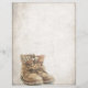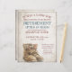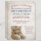Anúncio de aposentadoria com velhas botas de cadarço vestidas e em punho no estilo vintage. Texto relacionado ao gênero, o ano, o texto honorário, a data, a hora, o local de celebração e RSVP podem ser personalizados.